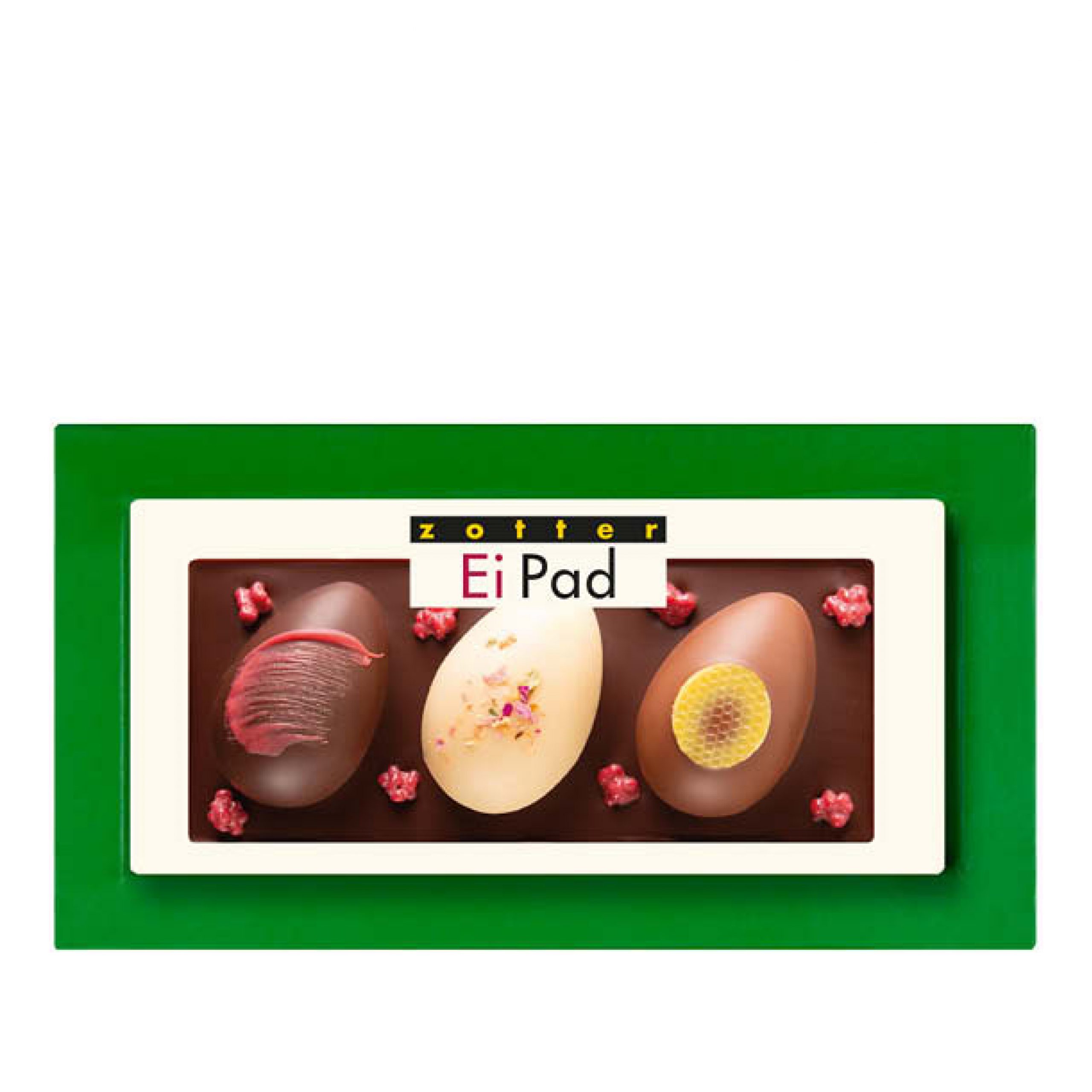 Eine klassische dunkle Schokoladentafel mit 70 % Kakaoanteil, geschmückt mit einem dunklen Schokoei, das mit Himbeergeistcreme gefüllt und mit pinker Himbeerkuvertüre verziert ist. Daneben ein weißes Schokoei, das mit selbst gemachtem Eierlikör gefüllt und mit Rosenblüten dekoriert ist. Außerdem ein Milchschokoei, das mit Marillenschnapscreme gefüllt und mit einer fruchtigen Maracuja-Dekor-Wabe hübsch geschmückt ist. Rundum mit knackigen Kakaonibs in fruchtiger Himbeerkuvertüre verziert. Alle Farben entstehen ganz natürlich nur aus Früchten und Beeren.