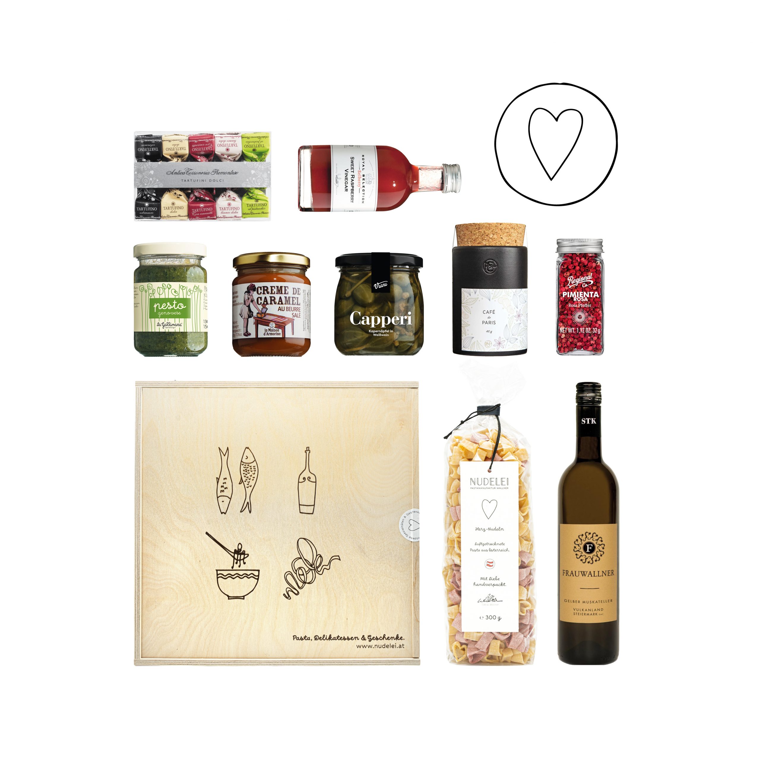 Die Genussbox enthält einen Gelben Muskateller vom Weingut Frauwallner, handgemachte Herz-Nudeln aus unserer Pastamanufaktur, Tartufi-Pralinen aus dem Piemont, ein Pesto Genovese aus Italien, Café de Paris Gewürzmischung in der Keramikdose, Kapernäpfel in Weißwein, rosa Pfeffer, einen süßen Himbeer-Essig und eine Karamellcreme aus Frankreich.