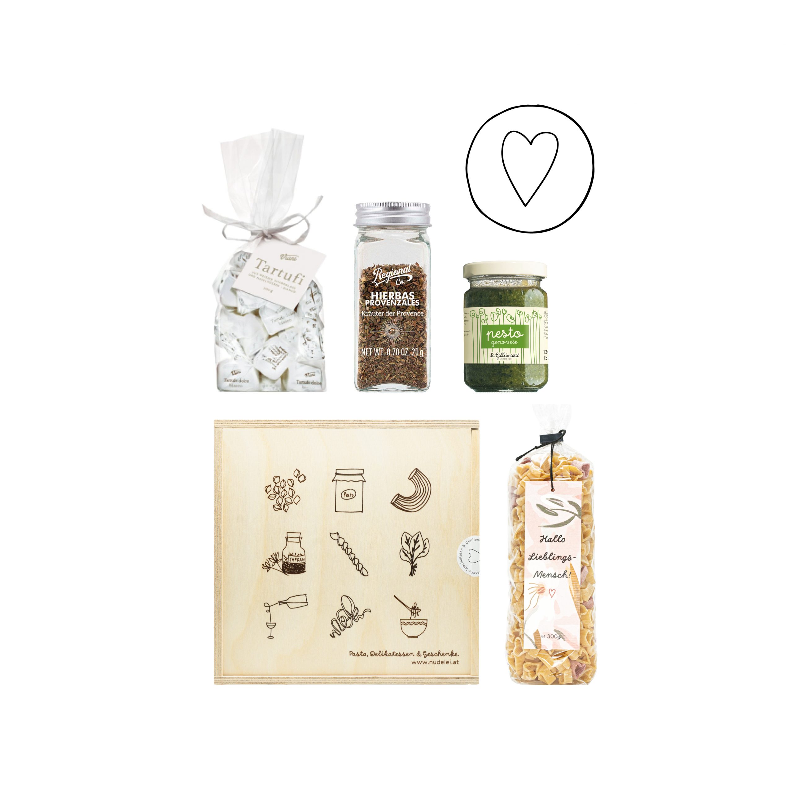 Die Genusskreation enthält Herz-Nudeln „Lieblingsmensch“, Tartufi mit weißer Schokolade aus dem Piemont, Kräuter der Provence und ein Pesto Genovese.