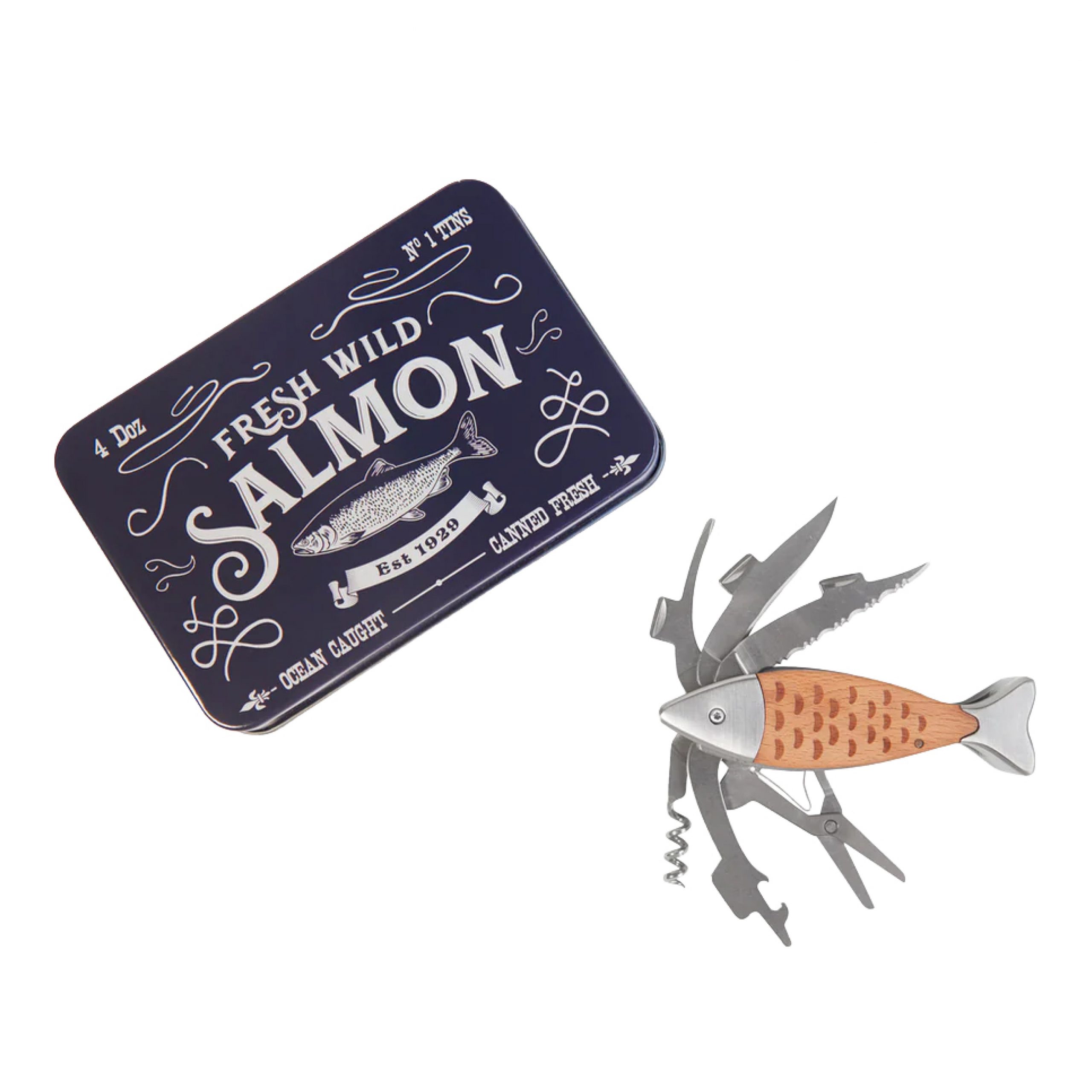 Dieses lachsförmige Multitool hat es in sich! Schere, Schraubenzieher, Flaschenöffner, Messer und Korkenzieher – alles in einem cleveren Design. Verpackt in einer Vintage-Fischdose ist es ein perfektes Geschenk für Meeresliebhaber, Heimwerker oder alle, die gerne zubereitet sind.