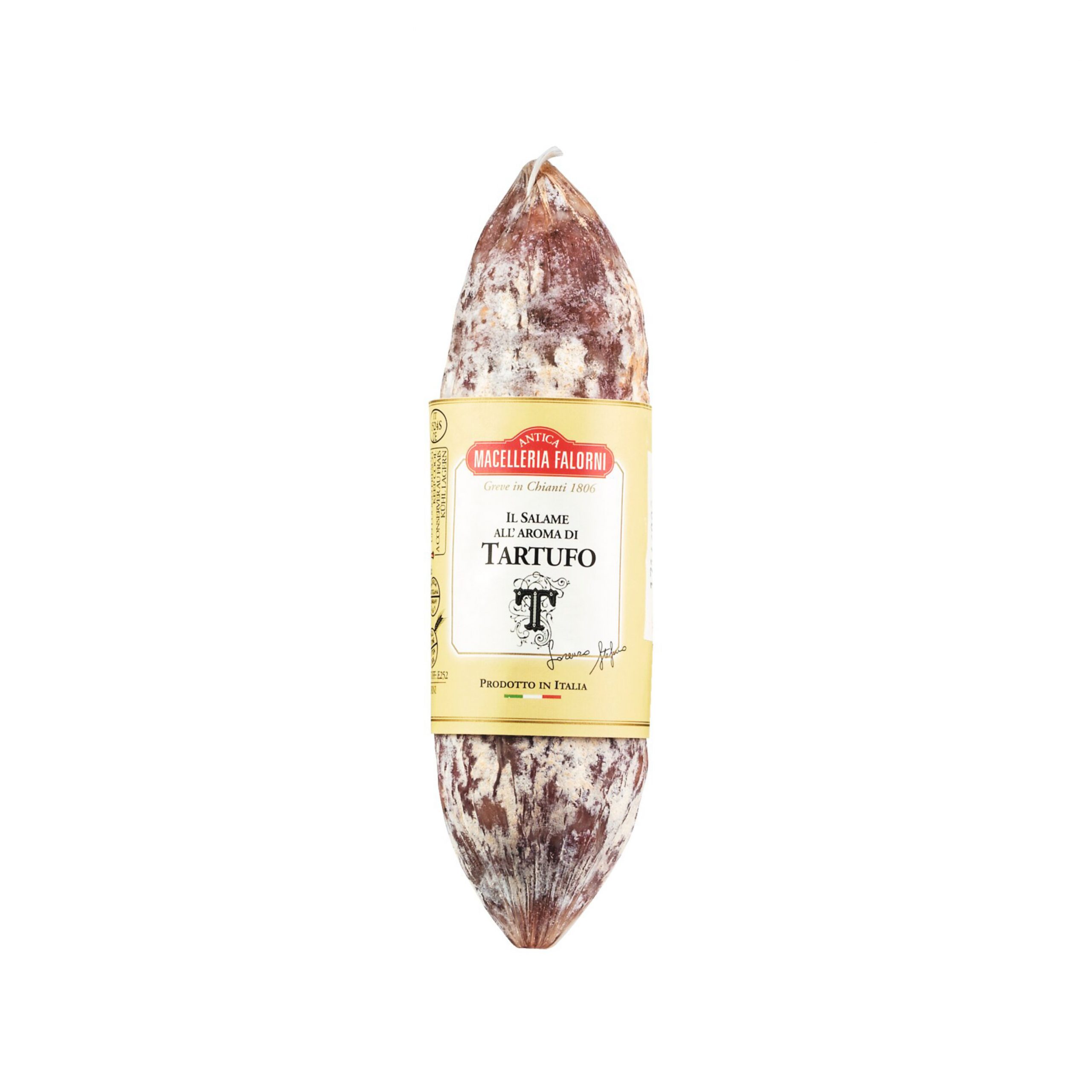 Dieses Salami besitzt einen besonderen Geschmack durch die Kombination der Aromen von weißen Trüffeln und der Wurst aus bestem Schweinefleisch. Zwei Monate gereift. Im Naturdarm mit Edelschimmel. In dünne Scheiben aufschneiden.